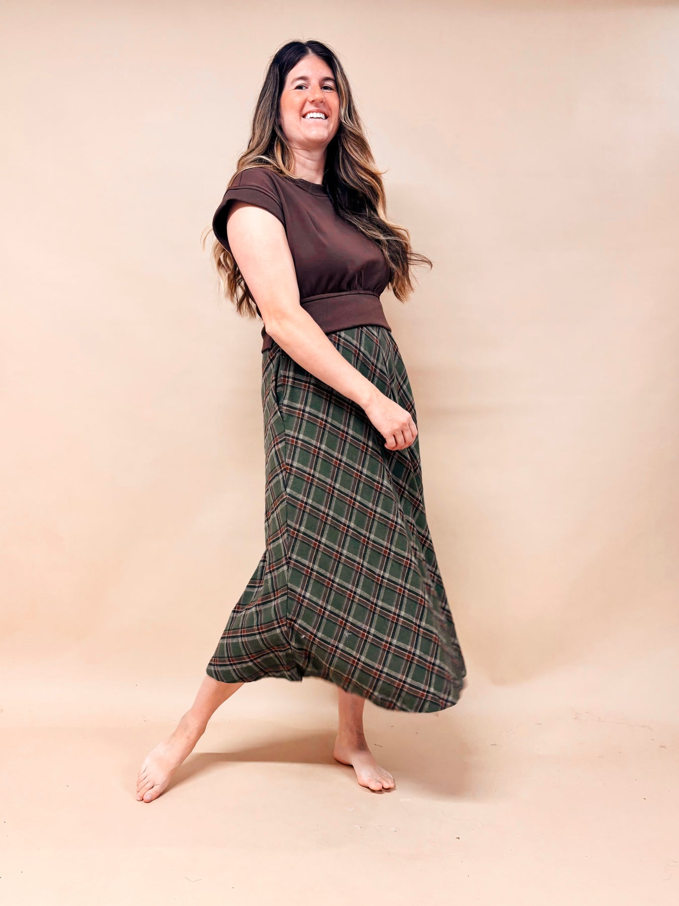 The Adeline is another one of our top picks for the holiday season! Designed in a gorgeous rich Scottish plaid print, with a comfortable cotton blend material, and a midi length, this piece is great to dress up or down for any holiday occasion!