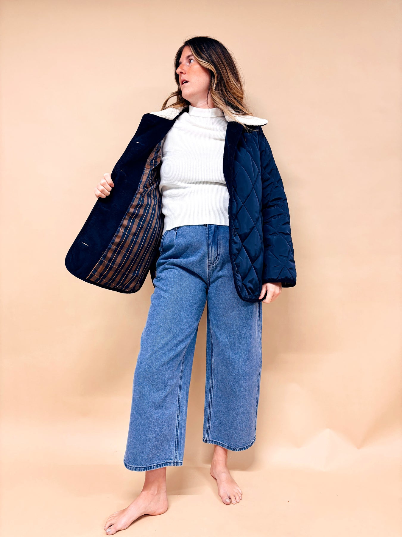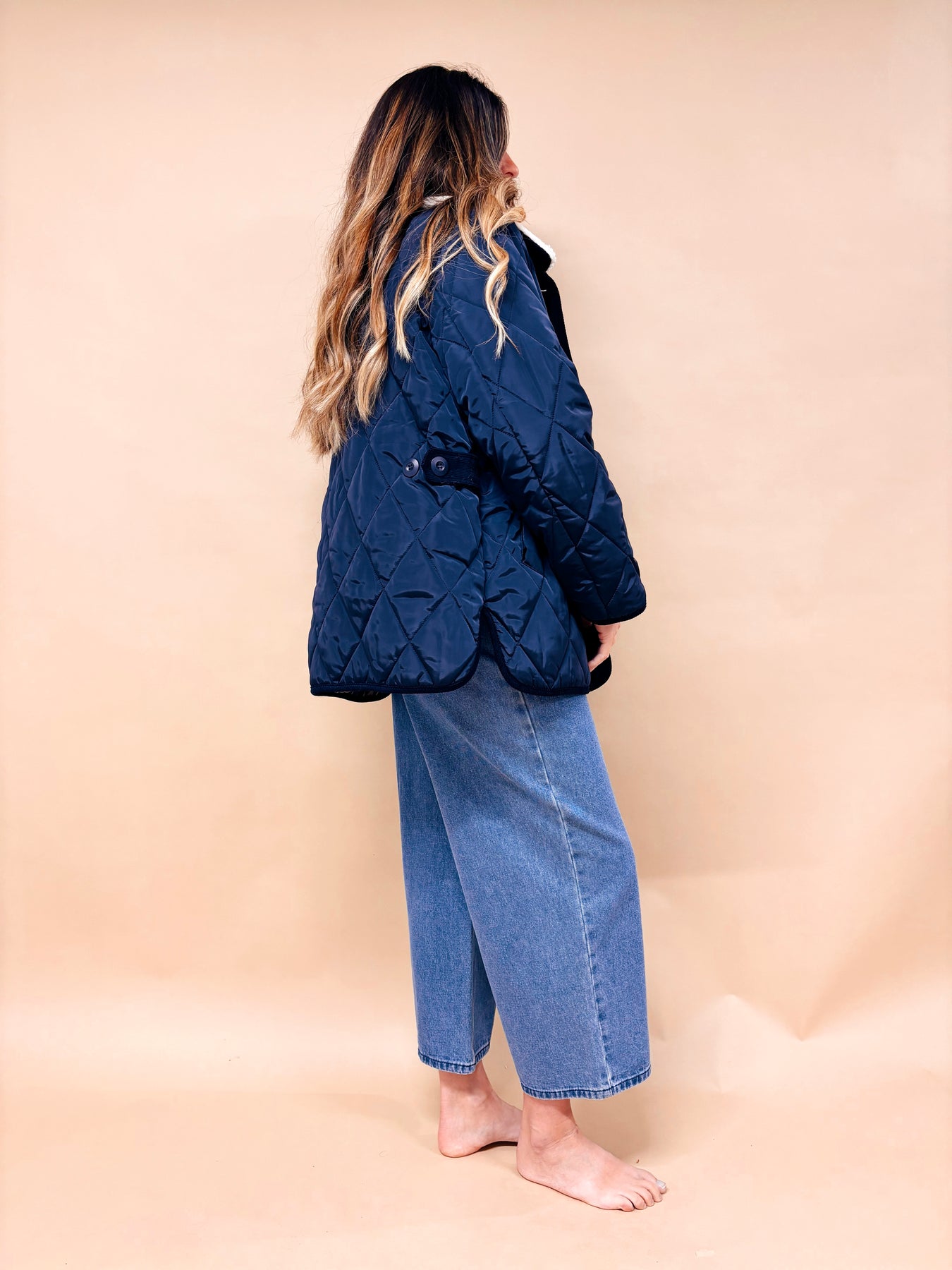 The Frenchie is a cute quilted dream! Designed in a rich navy blue color, with a sherpa collar, and a relaxed silhouette, this piece is a must have for those cold Winter days!