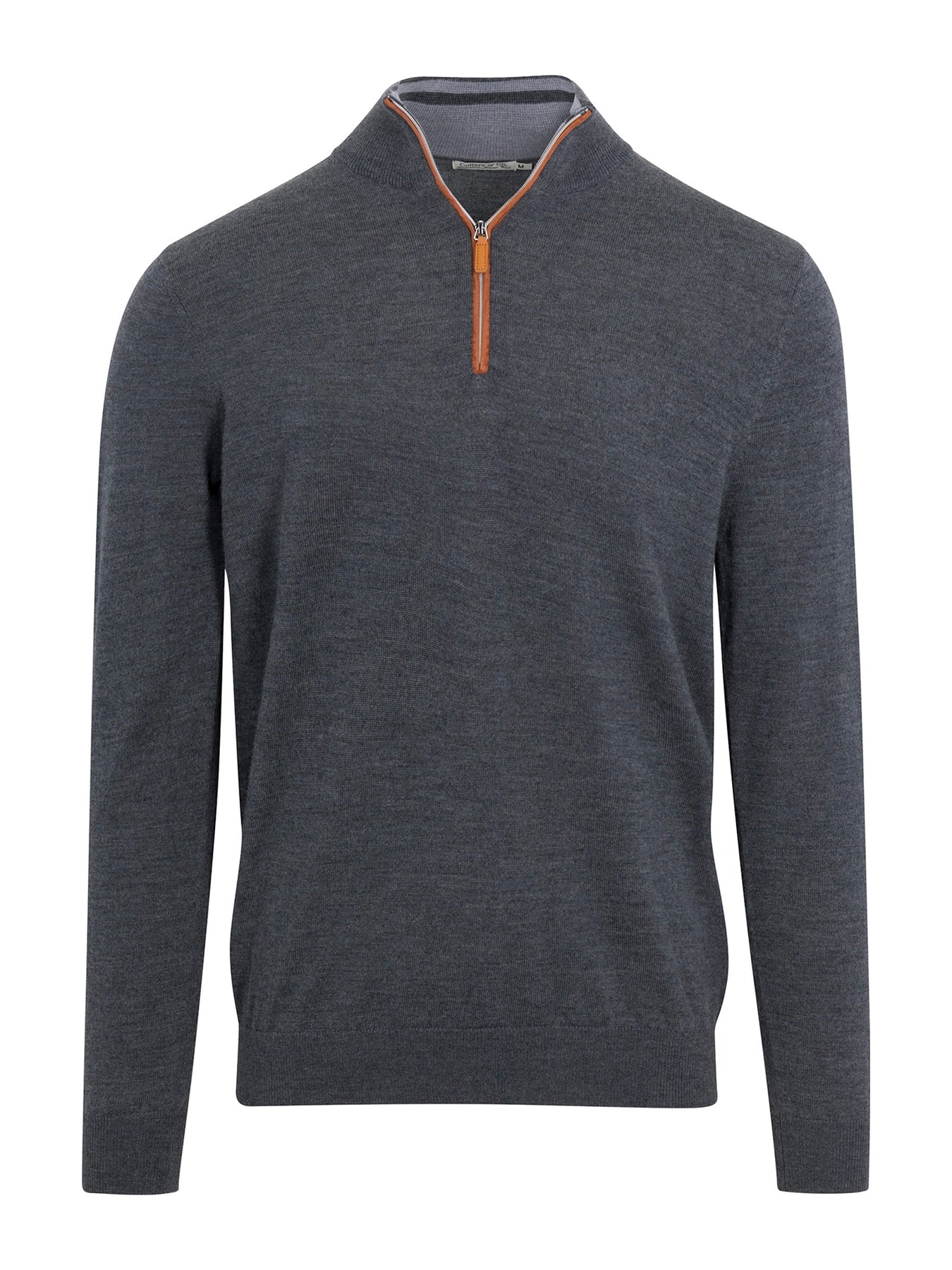 This piece is a must have for any modern day gentleman! Designed in an exceptionally comfortable merino wool knit material, With a suede quarter zip detailing, and a slim fit, this piece is an essential for any wardrobe