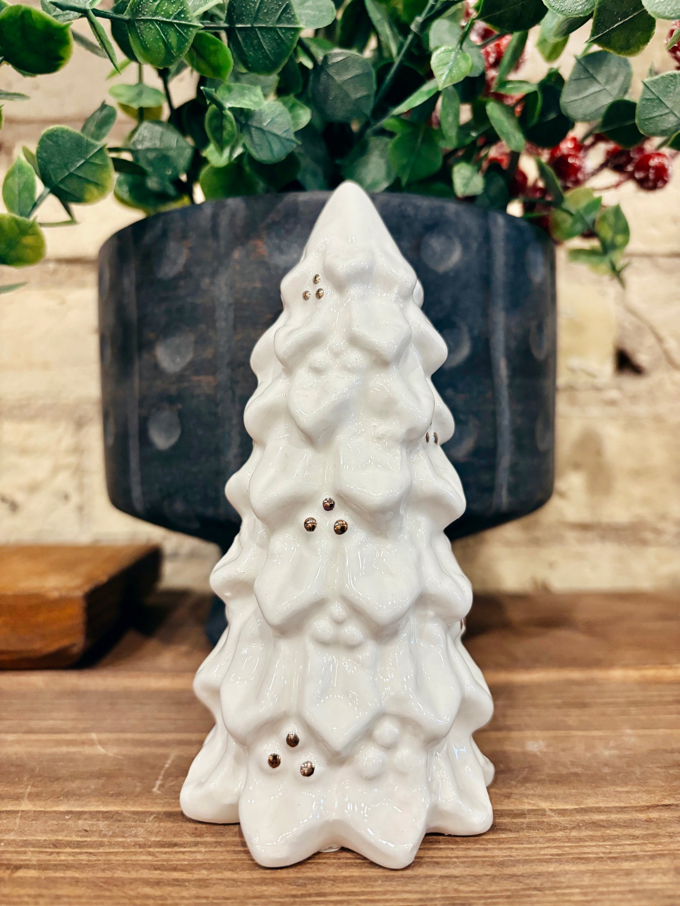 3-1/4" Round x 7"H, 3" Round x 6"H & 2-3/4" Round x 6"H Stoneware Christmas Trees w/ Gold Electroplating & 1 Stoneware LED Christmas Tree (Batteries Included)