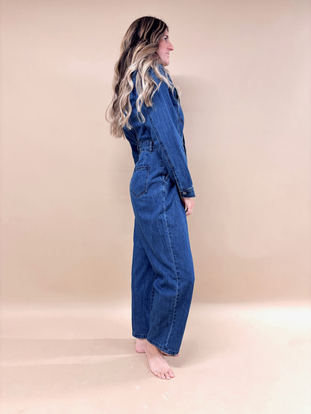 The Sawyer is an absolute show stopper of a jumpsuit! Designed in a medium wash blue, a cinched waist, functional pockets, and a gorgeous silhouette, this piece was made for pumpkin picking!