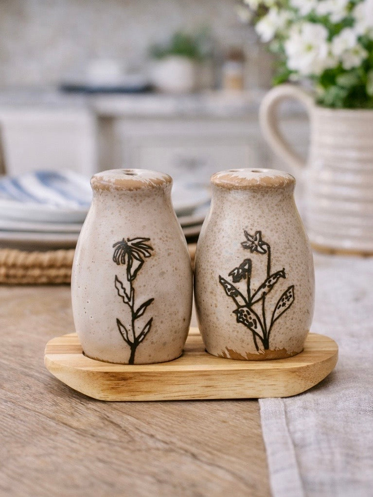 Stoneware Salt & Pepper Shakers w/ Tray, Set of 3