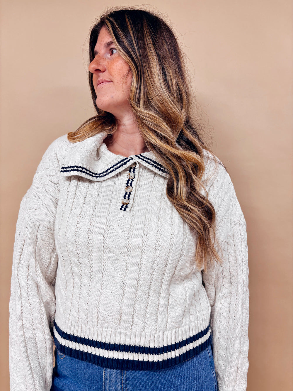 The Rosie may look a little familiar and that's because we keep coming back to her every season! Designed in a neutral color block, with a statement collar, and an exceptionally soft knit material, this piece will be one you pull out of your closets for many outfits to come!