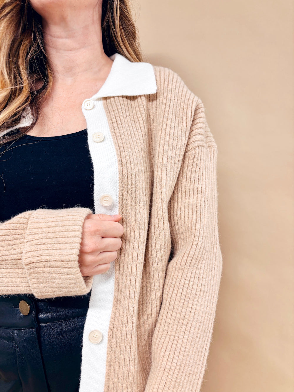 This cozy little number is the Karen! Designed with a two tone color pattern, a soft rubbed knit material, and a button down front closure, this piece is classic, cute, and oh so cozy!