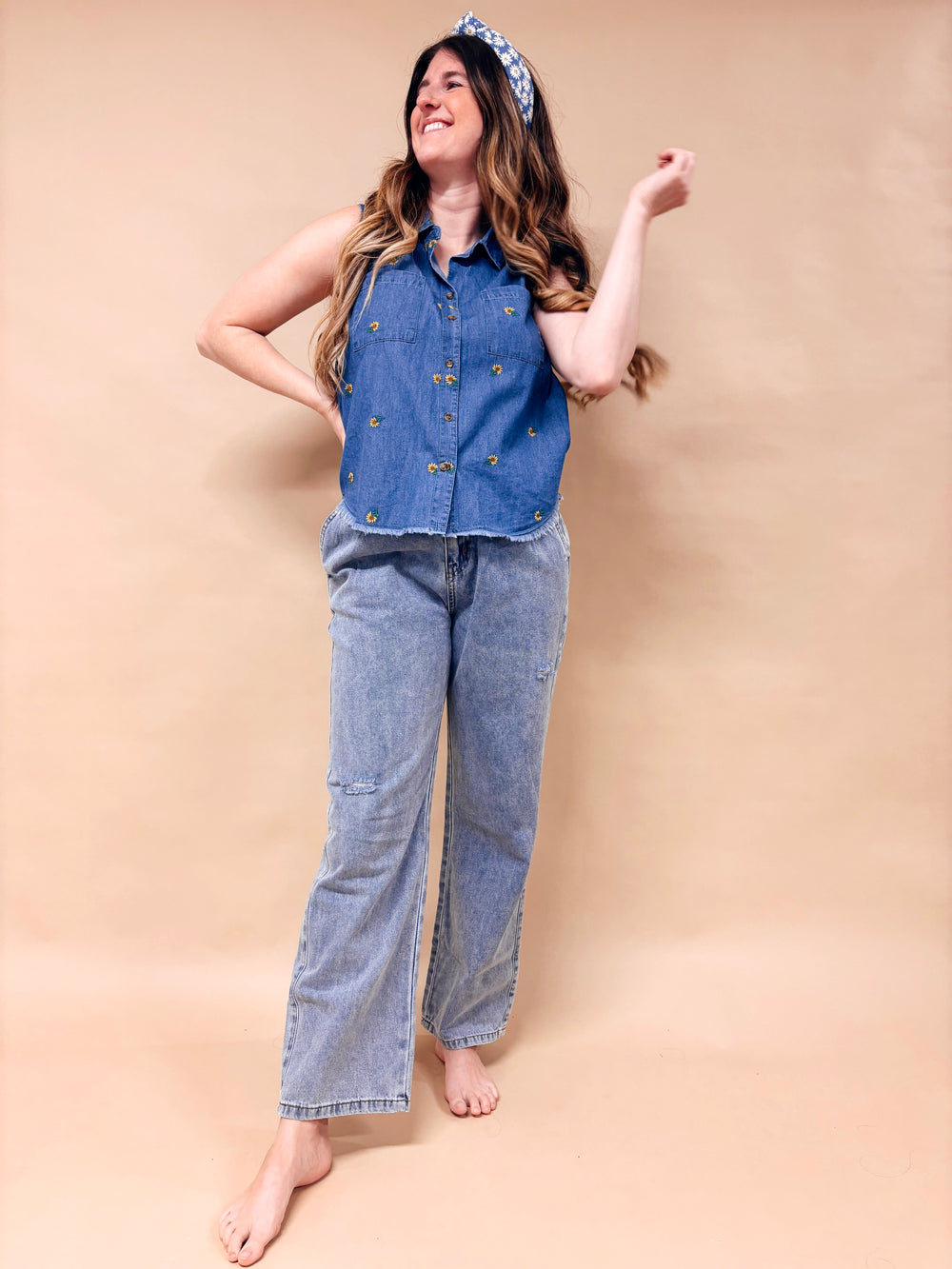 The Rylee gives 90's core energy! Picture a kitchen with ivy wallpaper, and all denim outfit, and dancing around to Shania Twain...regardless that's exactly why we love this retro inspired piece. Designed with an embroidered sunflower print, a mid wash denim color, and in a breathable cotton material...Let's go girls!
